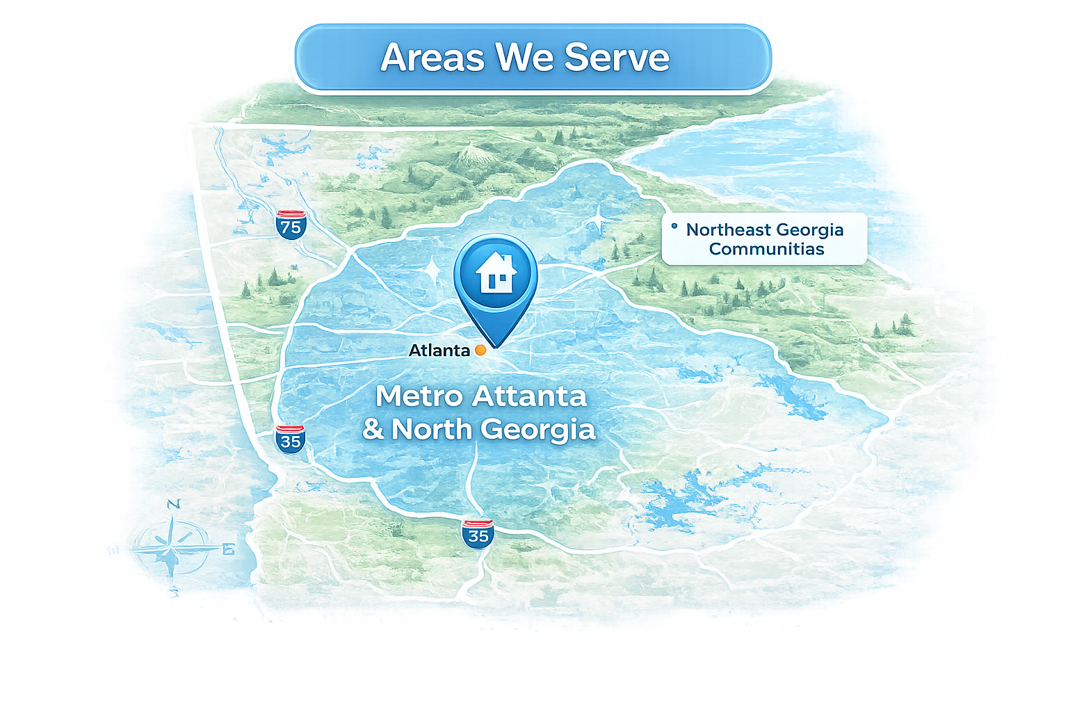 Most of our work is in Northeast Georgia, where new neighborhood developments are common, but we also regularly serve homeowners throughout Metro Atlanta and surrounding North Georgia communities. We understand local roofing styles, drainage challenges, and the impact of Georgia’s heavy rainfall and wooded landscapes.